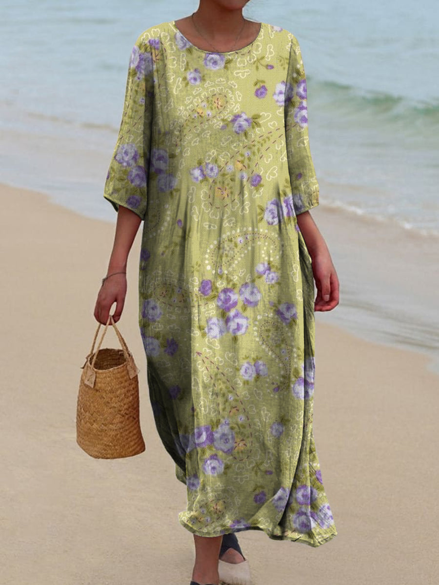 Retro Boho Floral Art Impreso Cuello Redondo Vintage Suelto Mangas Largas Midi Vestido