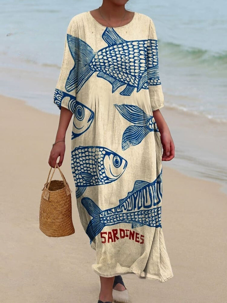 Retro Boho Floral Art Printed Round Neck Vintage Loose Long Sleeves Midi Dress