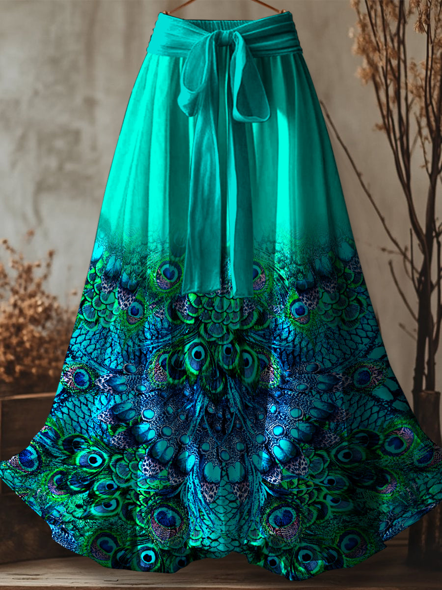 Retro Boho Floral Art Printed Vintage Bow Belt Casual Comfortable Stretch Waist Long Skirt