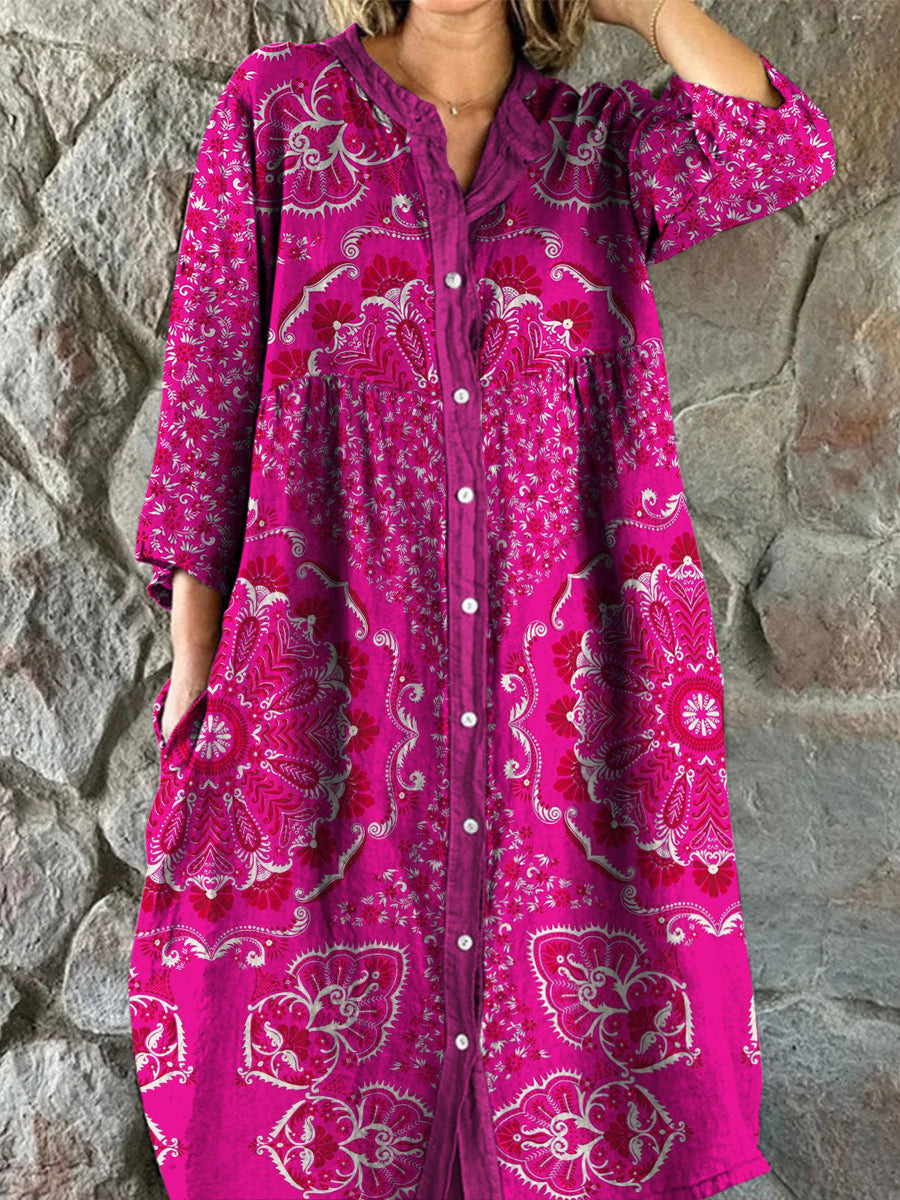 Retro Floral Art Print Vintage Chic V-Neck Button Up Long Sleeve Midi Dress