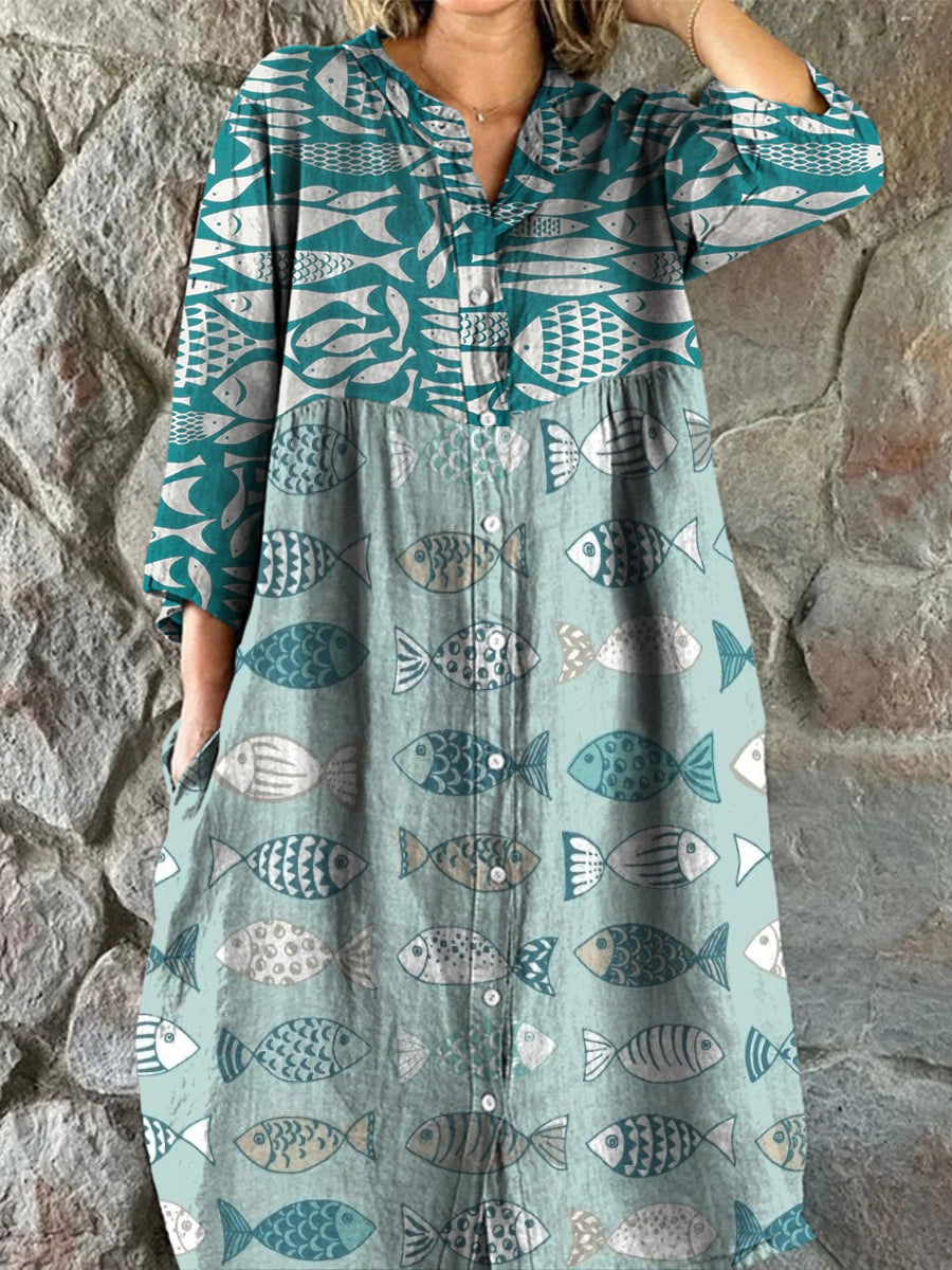Retro Floral Art Print Vintage Chic V-Neck Button Up Long Sleeve Midi Dress
