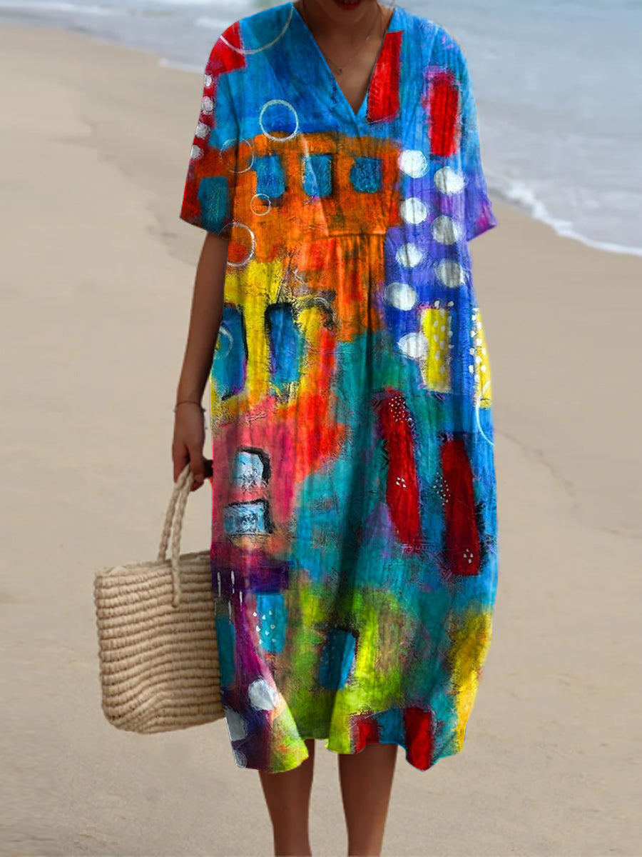 Vintage Art Print V-cuello elegante suelta de manga corta vestido de Midi
